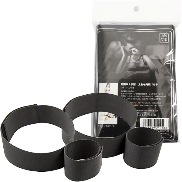 ●シートベルトのような頑丈素材●手枷付き太腿枷ベルト×2個●シンプルなマジックテープ着脱●締め付け具合の調節も自由自在●視界を塞ぐアイマスクも付属。