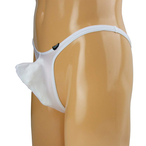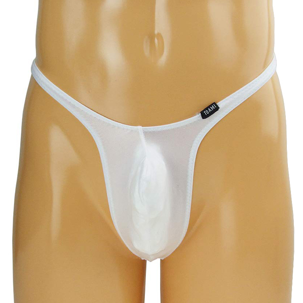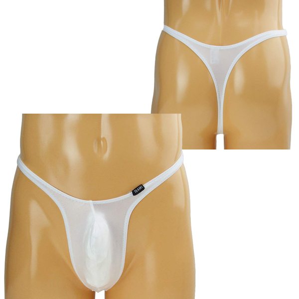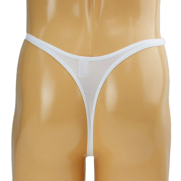 男性のシンボルを主張する上向き縫製の日本製メンズ用Tバック(白)。