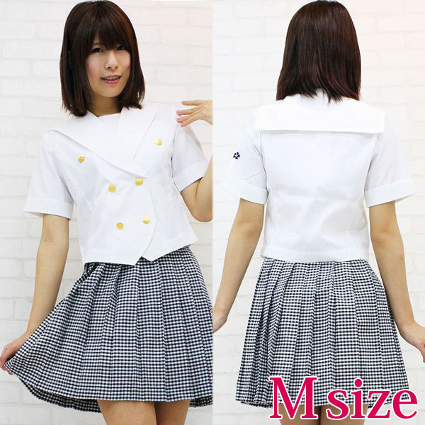 セット内容:上着(ピケ生地使用、前ボタン留め、金ボタン、左袖に校章付き)・スカート(横ファスナー、アジャスター有り、黒ギンガムチェック生地)