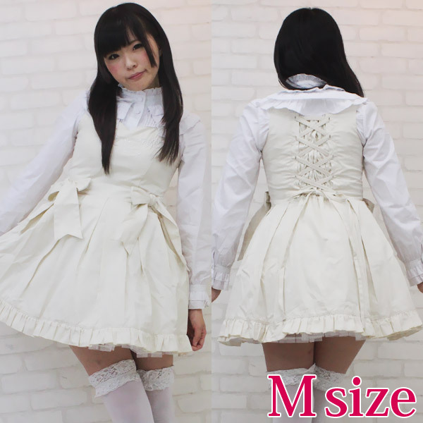 ふんわりフリルが可愛いロリータ服!クラシカルで上品なオフホワイトのジャンパースカート&長袖ブラウスセット(M)。