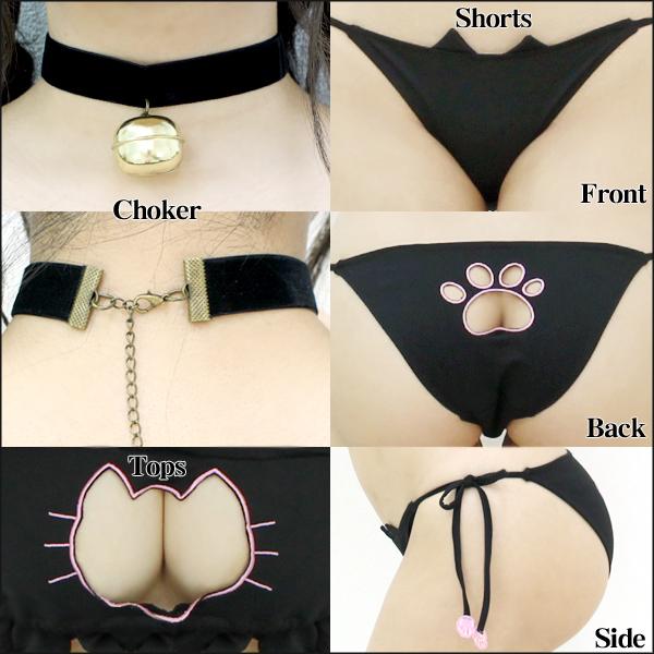 貴方だけのセクシーな黒猫に変身♪フリル×猫モチーフのキュートな水着が登場!まるでアニメコスチュームでありそうな、猫モチーフを所々に入れたデザインの水着♪胸の中央部、ショーツフロントには猫の顔、お尻とショーツ紐には肉球、さらに鈴付きのチョーカーでより猫感をプラス。