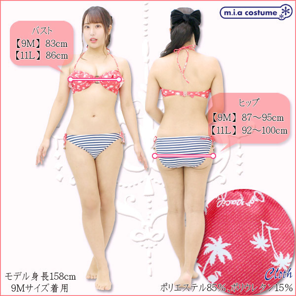 セット内容:トップス(パッド着脱可、ワイヤー無し)、ビキニショーツ 素材:ポリエステル85%、ポリウレタン15% 生産国:日本