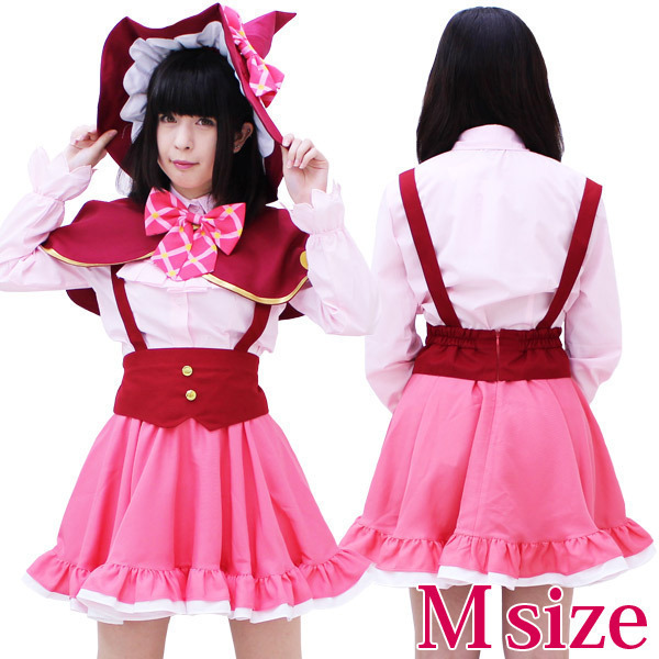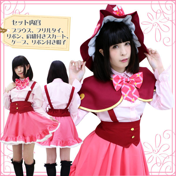 セット内容:ブラウス(前ボタン・袖口ゴム)、フリルタイ、リボン、肩紐付きスカート、ケープ(前スナップボタン留め)、リボン付き帽子(リボン固定用のスナップボタン付)