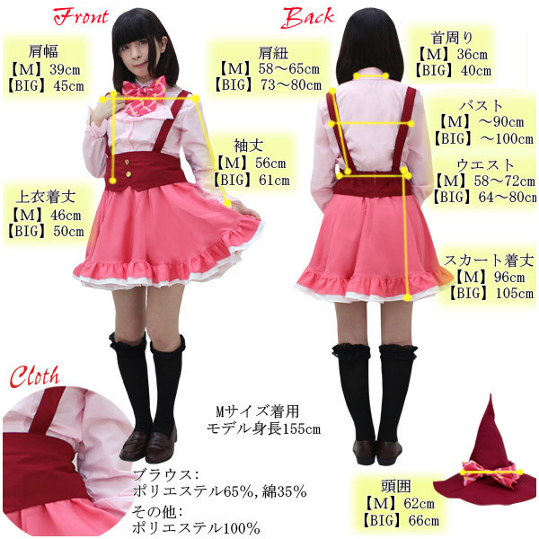 Mサイズ:B〜90cm・W58〜72cm ブラウス(肩幅39cm、袖丈57〜60cm、着丈58cm、首回り36cm) スカート(丈46cm、肩紐58〜65cm) 帽子:頭囲62cm
