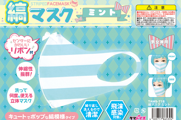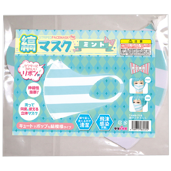 真ん中に可愛いリボンを装飾した白×ミントグリーンの爽やかな縞パン風立体マスク。